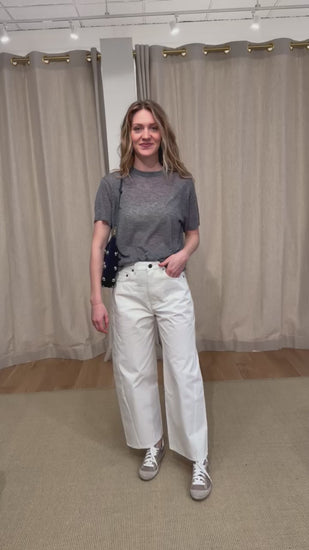 The Crescent Leg Crop in white cotton twill has an exaggerated cropped bow leg. Made from 100% organic cotton twill and perfect for a go-to everyday spring look.