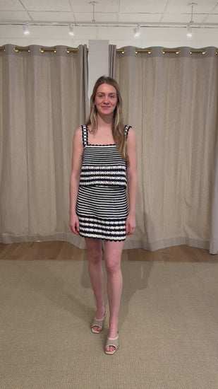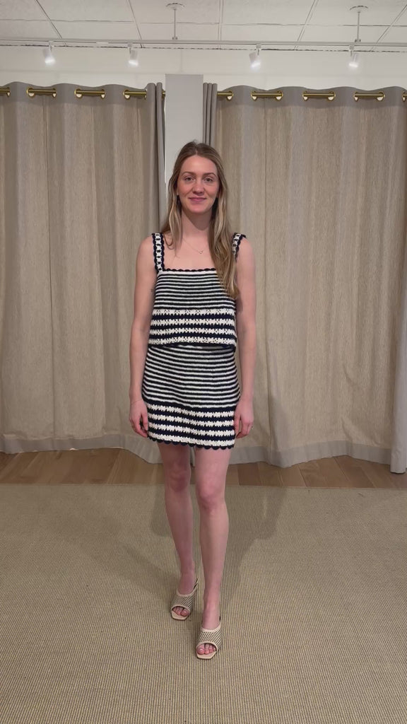 The Caria Crochet Cami Top is a versatile statement designed to evoke a sense of escape—effortlessly styled for both vacation ease and elevated moments. Hand-crocheted in a placed, open-texture stitch with a nautical ivory and navy stripe, it features wide shoulder straps and a flattering square neckline that create a softly structured silhouette. Delicate tassel ties at the back add a refined, decorative finish.