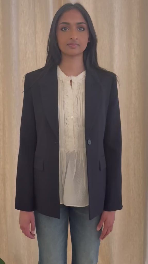 Single-breasted blazer in cavalry twill suiting. Fabric is a high-twist 100% wool suiting with a pronounced cavalry twill for a clean, modern tailored look. The Her Fit Blazer is tailored with custom-molded shoulder pads and a defined waist. Designed with a peaked lapel, single-button closure, and front flap pockets. Finished with a back vent.