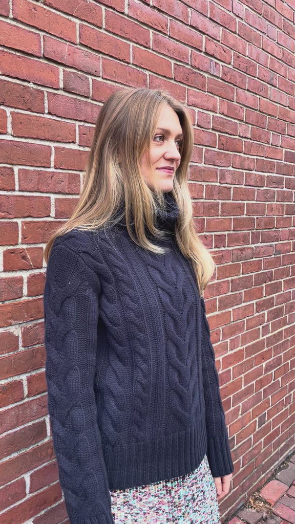 Long-sleeve cable knit turtleneck sweater in cashmere. Spun at an Italian heritage mill from single-origin yarns for exceptional softness. Boxy fit with a high neck. Detailed with dimensional cable knitting down the body and sleeves. Finished with ribbed collar, cuffs, and hem.